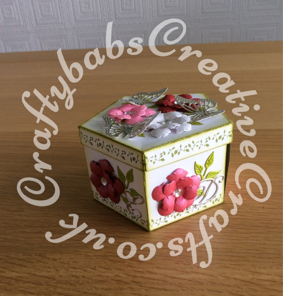 Exploding Box card made using a number of dies including The Tattered Lace Pentagon box die set, sentiments 2014 and mini butterfly dies, Cheery Lynn Lace script alphabet, Butterfly and ivy leaf strip dies, Spellbinders vintage floret dies, Crafters Companion Die sire - Essentials Only Words Dies Numbers. My mind's eye Bloom & Grow clear stamp set - craftybabscreativecrafts.co.uk