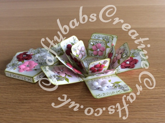 Exploding Box card made using a number of dies including The Tattered Lace Pentagon box die set, sentiments 2014 and mini butterfly dies, Cheery Lynn Lace script alphabet, Butterfly and ivy leaf strip dies, Spellbinders vintage floret dies, Crafters Companion Die sire - Essentials Only Words Dies Numbers. My mind's eye Bloom & Grow clear stamp set - craftybabscreativecrafts.co.uk