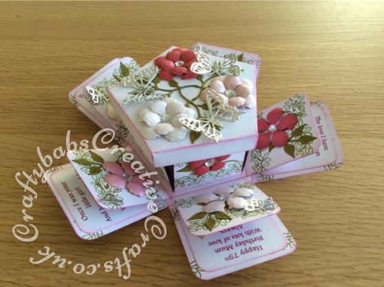 Exploding Box card made using a number of dies including The Tattered Lace Pentagon box die set, sentiments 2014 and mini butterfly dies, Cheery Lynn Butterfly and ivy leaf strip dies, Spellbinders vintage floret dies, Britannia dies Happy Birthday sentiments and Papermania Birdsong borders stamps - craftybabscreativecrafts.co.uk