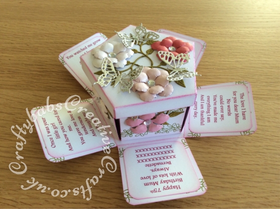 Exploding Box card made using a number of dies including The Tattered Lace Pentagon box die set, sentiments 2014 and mini butterfly dies, Cheery Lynn Butterfly and ivy leaf strip dies, Spellbinders vintage floret dies, Britannia dies Happy Birthday sentiments and Papermania Birdsong borders stamps - craftybabscreativecrafts.co.uk