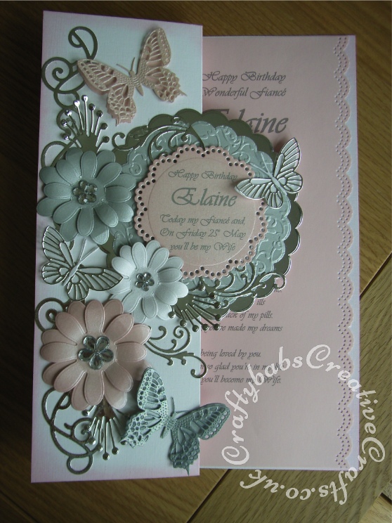 A4 Floral Butterfly birthday card made using Quickutz cookie cutter curly flourish border die, Quickutz lifestyle scalloped circle dies, Nellies's nested Threaded Scallop Circle Layering Dies, Sizzix originals hearts die, Xcut Petal posies dies, Cheery Lynn exotic butterfly die and Memory Box Kaleidoscope and Moonlight butterfly dies, Marianne frame and swirls set flourish dies and anja's leaves die, - craftybabscreativecrafts.co.uk