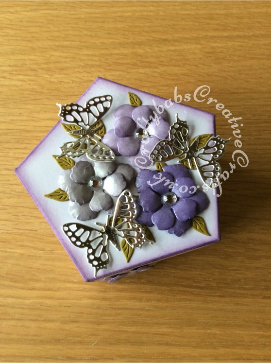 Exploding Box card made using a number of dies including The Tattered Lace Pentagon box die set, sentiments 2014 and mini butterfly dies, Cheery Lynn Lace script alphabet, Butterfly and ivy leaf strip dies, Spellbinders vintage floret die, Britannia dies Happy Birthday sentiments and Papermania Birdsong borders stamps.