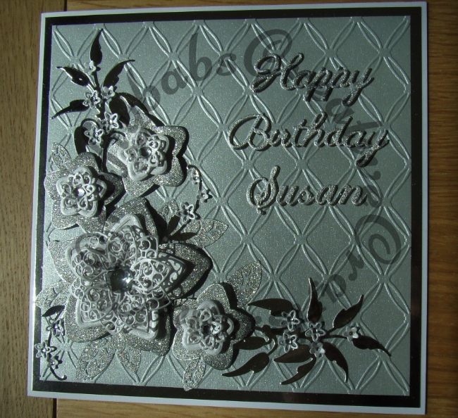 Floralsusan1 Published May 4, 2015 at 650 × 594 in Ladies Extra Special ← Previous Next → 8″ x 8″ Card made using Tattered Lace chains embossing folder, Tattered Lace Kaleidoscope flower and leaf dies, Marianne leaf spray die, Britannia dies sentiment and Cheery Lynn alphabet dies.