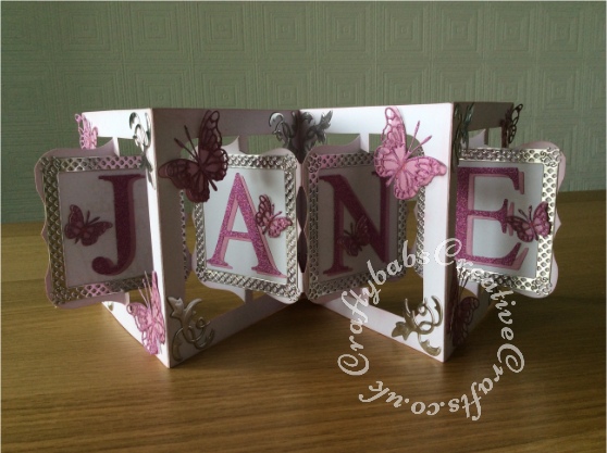 Accordion flip card made using Sizzix Bigz accordion flip 3d die, frames cut with Tattered Lace Chatsworth square die, Lettering cut with Quickutz Mary Jane cookie cutter alphabet dies. Butterflies cut using Memory Box dies, corner embellishments cut using tonic die from beautiful brambles die set. Sentiments cut using Tattered lace sentiment dies and Sizzix, Tim Holtz thinlit sentiment die.