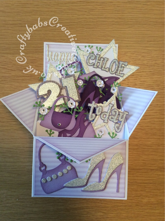 Large Pop Up Shoes & Bags themed 21st Birthday card made from 8″x8″ card blank. Numerous dies used including;