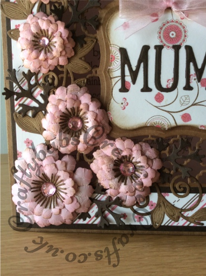 Birthday card for mum made using mostly Spellbinders dies including; Spellbinders 6x6 card creator labels 1, Spellbinders shapeabilities flower bundle, Spellbinders Majestic morning blooms, Spellbinders foliage, Spellbinders Julius Alphabet dies, D-lites sentiments 3, Labels One nesting dies and Cheery Lynn build a flower 1 for flower centres. Die cuts embossed with ball shaping tool and inked with Tim Holtz Walnut stain distress ink. Flat back gems used for flower centres adhered with glossy accents - craftybabscreativecrafts.co.uk