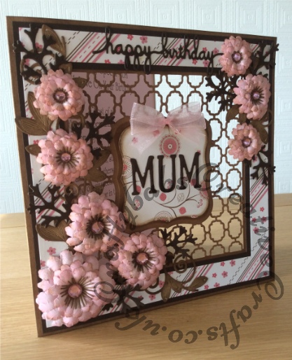 Birthday card for mum made using mostly Spellbinders dies including; Spellbinders 6x6 card creator labels 1, Spellbinders shapeabilities flower bundle, Spellbinders Majestic morning blooms, Spellbinders foliage, Spellbinders Julius Alphabet dies, D-lites sentiments 3, Labels One nesting dies and Cheery Lynn build a flower 1 for flower centres. Die cuts embossed with ball shaping tool and inked with Tim Holtz Walnut stain distress ink. Flat back gems used for flower centres adhered with glossy accents - craftybabscreativecrafts.co.uk