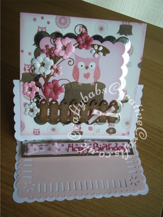 Owl & Floral Easel Birthday Card made using various dies including, Marianne Creatables Happy Birthday sentiment dies, Memory Box Gwyneth Flourish die, My Favourite Things Dainty Bows die, Sizzix Thinlits bunch of flowers dies and La la Land's Pickett heart Fence die - craftybabscreativecrafts.co.uk