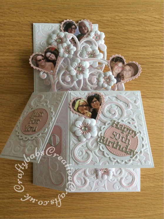 Pop up 50th Birthday card made using a number of dies including; Spellbinders nesting plain and scalloped hearts dies, Cheery lynn flowers dies, Anna griffin flourish scroll die, spellbinders lacey circles dies, leabilities frame square curve die set (for small flourishes), Nellies nesting stitched squares and circle dies, Background embossed with Spun Sugar distress ink applied to folder using embossaliscious a4 folder. die cuts inked with Spun Sugar distress inks, Tattered Lace sentiments 2014 dies and Date to Remember dies, Spellbinders etched alphabet die set for numbers - craftybabscreativecrafts.co.uk