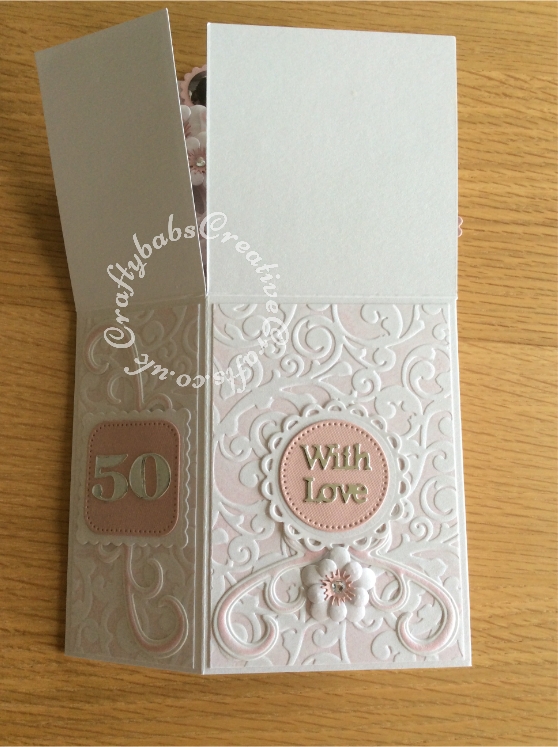 Pop up 50th Birthday card made using a number of dies including; Spellbinders nesting plain and scalloped hearts dies, Cheery lynn flowers dies, Anna griffin flourish scroll die, spellbinders lacey circles dies, leabilities frame square curve die set (for small flourishes), Nellies nesting stitched squares and circle dies, Background embossed with Spun Sugar distress ink applied to folder using embossaliscious a4 folder.