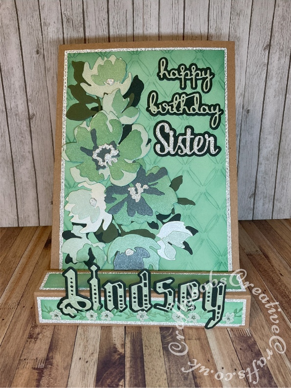 Floral Block easel card made using various dies including : Altenew Watercolour garden dies, The Paper Boutique Female relatives dies, Tattered Lace Expression of Lace lower case alphabet dies, Spellbinders Thanks Enclosed Sentiments Etched Dies and Tattered Lace Chains Embossing Folder. - craftybabscreativecrafts.co.uk