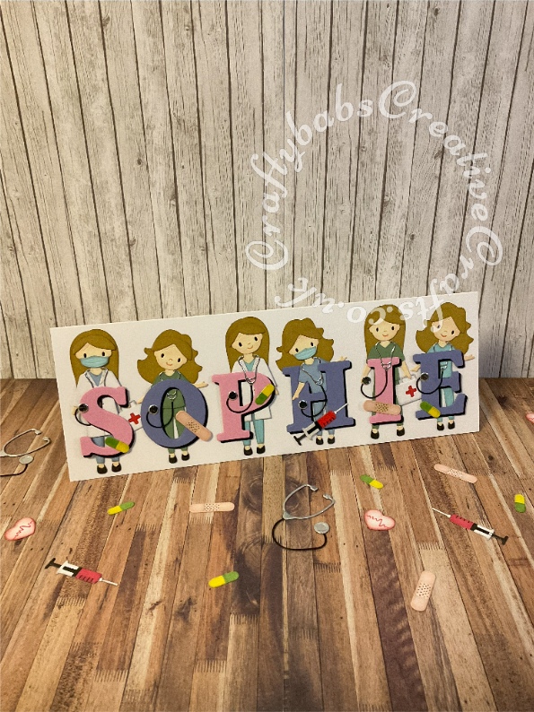 Medical themed A4 Landscape long thin birthday card made using various dies including; Cardmaking Magic Solid Alphabet Letter Upper case Die Set, Globeland medical die set, unbranded medical die set and Quickcutz Revolution Girl Doll hair die. - craftybabscreativecrafts.co.uk