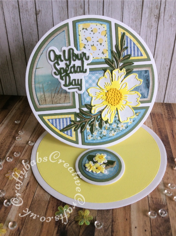 Easel card made using Card Making Magic Tapis Builder Die set by Christina Griffiths plus nesting circles dies, Gemini Elements Double-Sided Flower Die – Cosmos, Altenew garden picks die, Paper Boutique Sentiment dies and 6” x 6” paper pads from The Works.