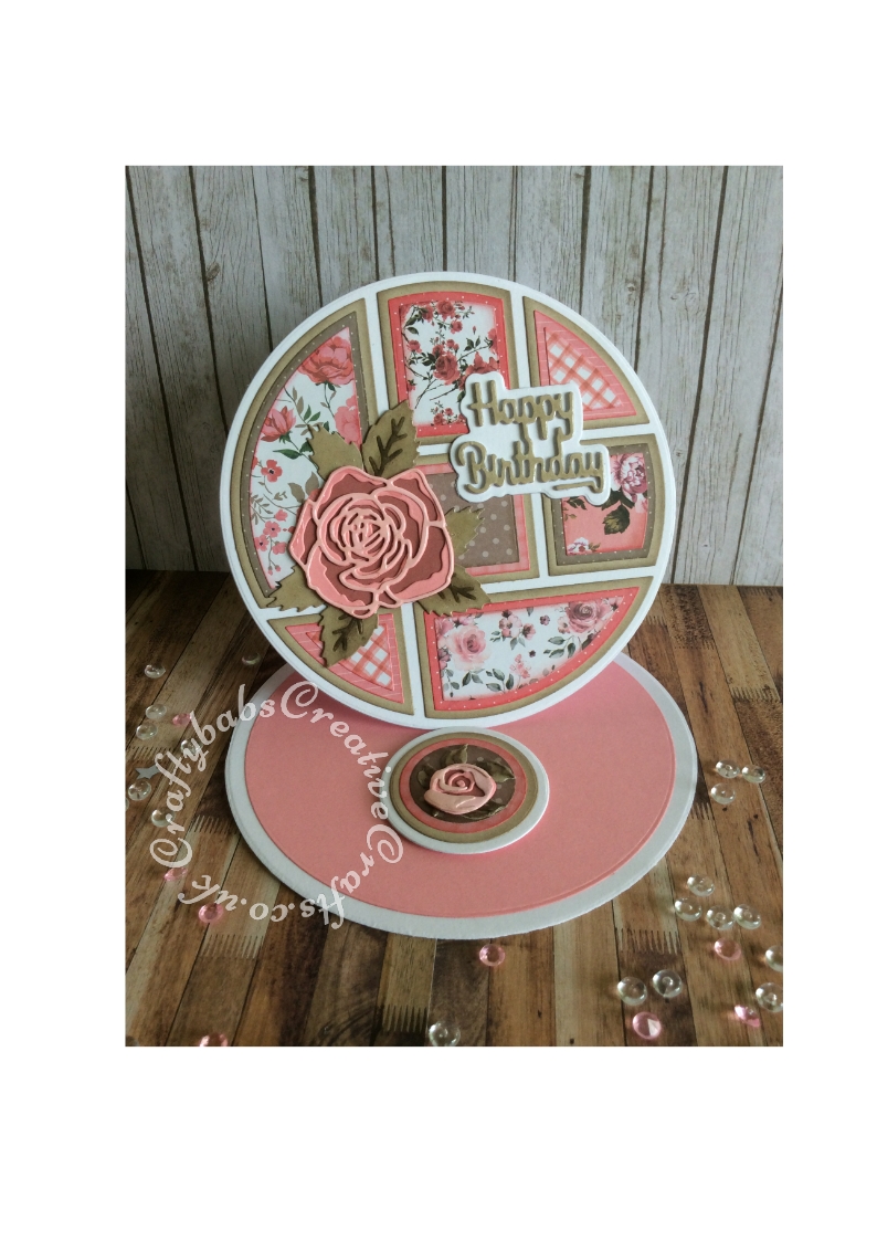 Easel card made using Card Making Magic Tapis Builder Die set by Christina Griffiths plus nesting circles dies, CMM Christina Griffiths Christmas Rose dies, Altenew rose flourish die, Paper Boutique Sentiment dies and 6” x 6” paper pads from The Works.