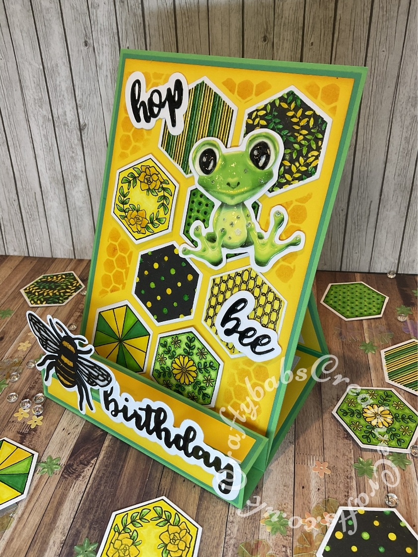 Pop up Easel Block Birthday Card. Fold inspired by Sam Calcott of Mixed up craft. Made using various dies including Sizzix Thinlits Die Set 4 Pack 663852, Bee by Lisa Jones, stamps free with issue 109 of Creative Stamping Magazine, Tattered Lace Freda Frog die and download, Bright Rosa Sentiment dies snipped to create the words ‘hop’ and ‘bee’ and nesting hexagon dies.