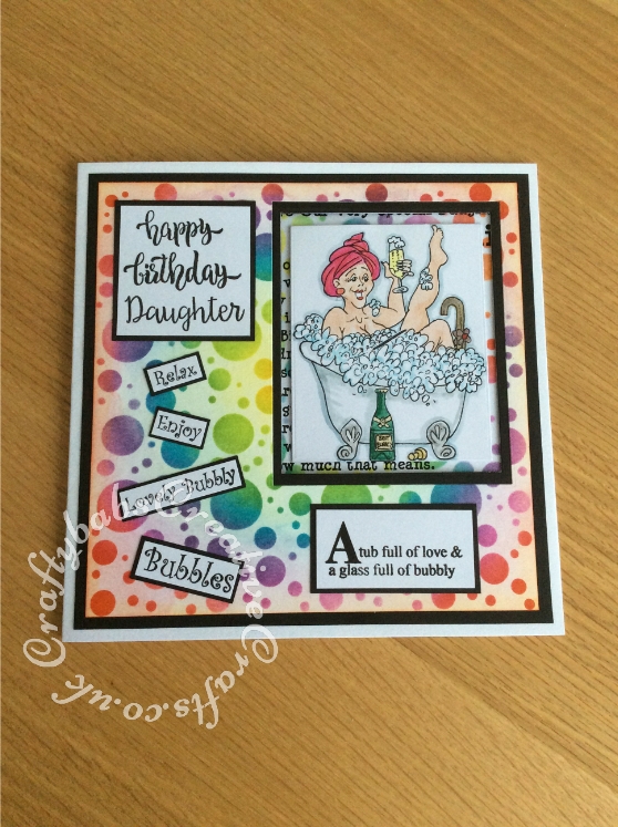 Large 8″x 8″ Spinning image Birthday card made using La Pashe Flippin Women Bubble Bath stamp set, coloured with distress inks. Background inked through stencil with distress inks. Window for spinner and stamped images cut using Tattered Lace essential rectangles dies.