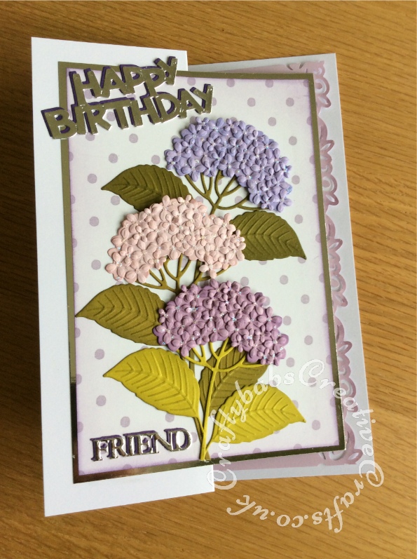 K1 Published March 19, 2019 at 595 × 797 in Ladies General ← Previous Next → Bithday Card for a Friend made using various dies including; Impression Obsession Hydrangea Die Set, , Tattered Lace Happy Birthday (ETL128) die and Friend sentiment from the Sue Wilson Necessities Collection – In The Tool Box die set.