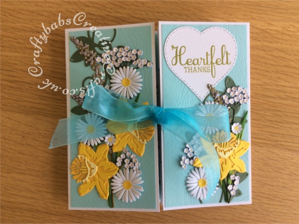 Double Shutter Thank You card made using various dies and stamps including; Tim Holtz – Wildflowers #1 661190, Cheery Lynn Designs Die – Build a Flower Embellishment #2, Altenew Layered Daffodil Die Collection free with issue 188 of Simply Cards& Papercraft, Spellbinders romantic vines dies, Tattered Lace Venetian floral dies, Memory Box tulip petals die, Sue Wilson Die Set – Exquisite Poppy for flower centres, Tonic Studios 786 Simplicity Punch, Classic Flower Head and various small daisy punches plus some unbranded nesting rectangles and heart dies.