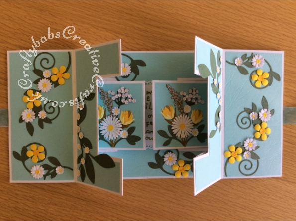 Double Shutter Thank You card made using various dies and stamps including; Tim Holtz – Wildflowers #1 661190, Cheery Lynn Designs Die – Build a Flower Embellishment #2, Altenew Layered Daffodil Die Collection free with issue 188 of Simply Cards& Papercraft, Spellbinders romantic vines dies, Tattered Lace Venetian floral dies, Memory Box tulip petals die, Sue Wilson Die Set – Exquisite Poppy for flower centres, Tonic Studios 786 Simplicity Punch, Classic Flower Head and various small daisy punches plus some unbranded nesting rectangles and heart dies.