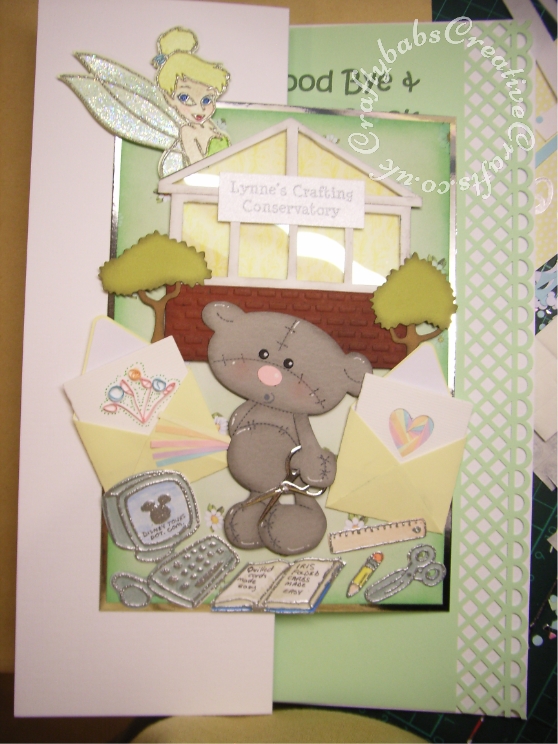 A4 Crafting themed retirement/leaving job card made using a variety of dies including Custome made bear die, Cuttlebug Disney cut & emboss dies for tinkerbell, computer, book, scissors pencil & ruler, Cuttlebug cuttlekids tree dies, Cuttlebug 2×2 scissors die and Fiskars texture plate for brick wall embossing.