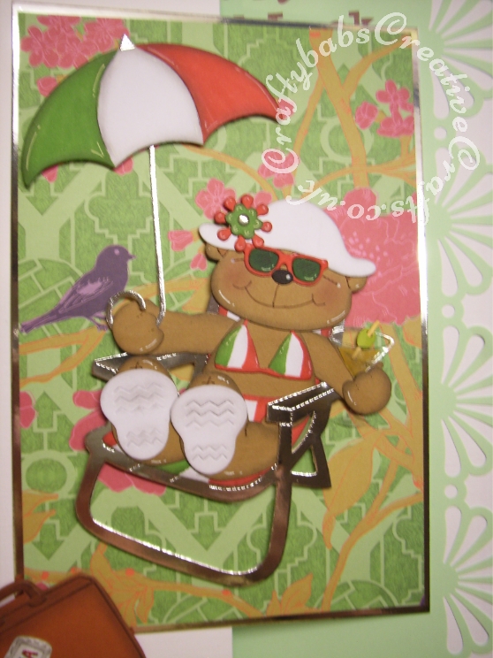 A4 Italian Holiday themed retirement/leaving job card made using mostly custom made wooden dies for bear & hat, Quickutz revolution umbrella die, Quickutz 2×2 martini glass die, Go Kreate Boo bear on holiday die for sunglasses and Cuttlebug Disney cut & emboss set for suitcase.