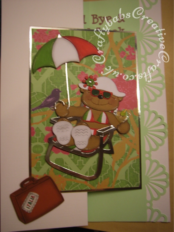A4 Italian Holiday themed retirement/leaving job card made using mostly custom made wooden dies for bear & hat, Quickutz revolution umbrella die, Quickutz 2×2 martini glass die, Go Kreate Boo bear on holiday die for sunglasses and Cuttlebug Disney cut & emboss set for suitcase.