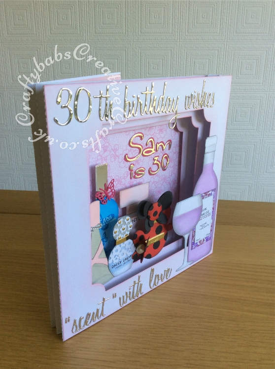 Large 8"x 8" Perfume themed Panorama 30th Birthday Card made using Various dies including; Various Sizzix Tim Holtz thinlits 'Script@ words, Sizzix Sizzlits 'Catty Corner' alphabet dies, Numbers from the Sizzix - Tim Holtz - Alterations Collection - Thinlits Die - Alphanumeric, Script alphabet dies, Wine bottle Die from Die Cutting Essentials Magazine Issue 28 and base of glass from same set, top of glass made using Tattered Lace Essentials Teardrop Cutting Dies ETL183 trimmed to shape. Perfume bottles made using various dies including circles, tear drops and trimmed to shape, Base card made using Tattered Lace Large panorama dies partially cut then extended to fit 8"x 8" card, apertures cut using Tattered Lace Essentials notched Squares dies. - craftybabscreativecrafts.co.uk