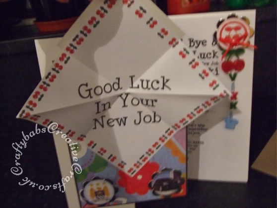 A4 Quirky Pop-Up Front Leaving card themed to the recipient made using Quickutz Cookie cutter flower die, Quickutz nesting circles dies, Sizzix Originals cherry die and Shadow Box Alphabet (for shrink plastic letters) which have been linked together with jump rings and made into a dangling charm. - craftybabscreativecrafts.co.uk
