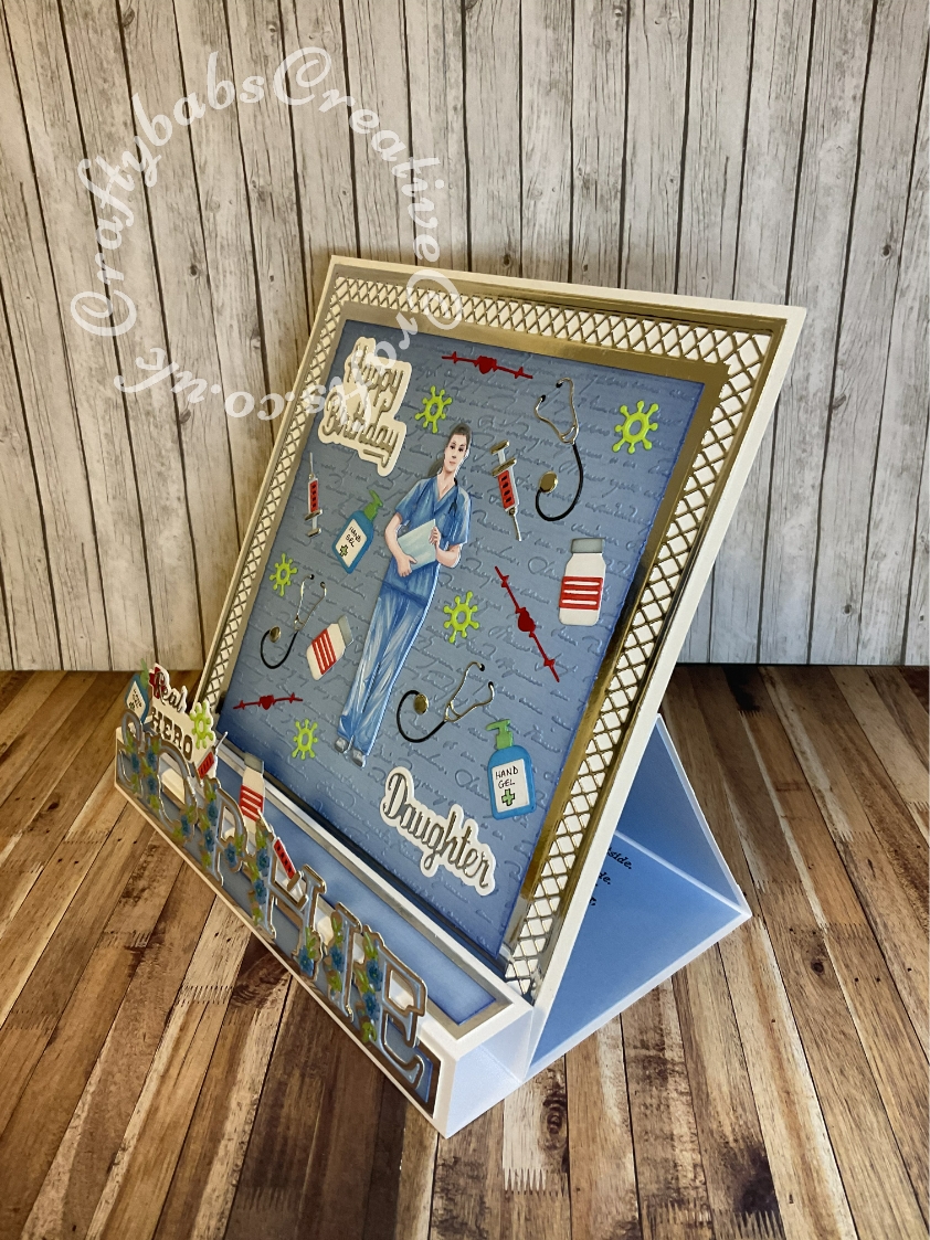 Pop up Easel Block Birthday Card. Fold inspired by Sam Calcott of Mixed up craft. Made using various dies including:- PAPER DISCOVERY DIE SET CARD BUILDER NESTED SQUARES | SET OF 10, unbranded ‘Real Hero’ medical items die set, Paper Boutique sentiment dies. Tattered Lace Hand Drawn alphabet dies and Tattered lace Script Embossing Folder.