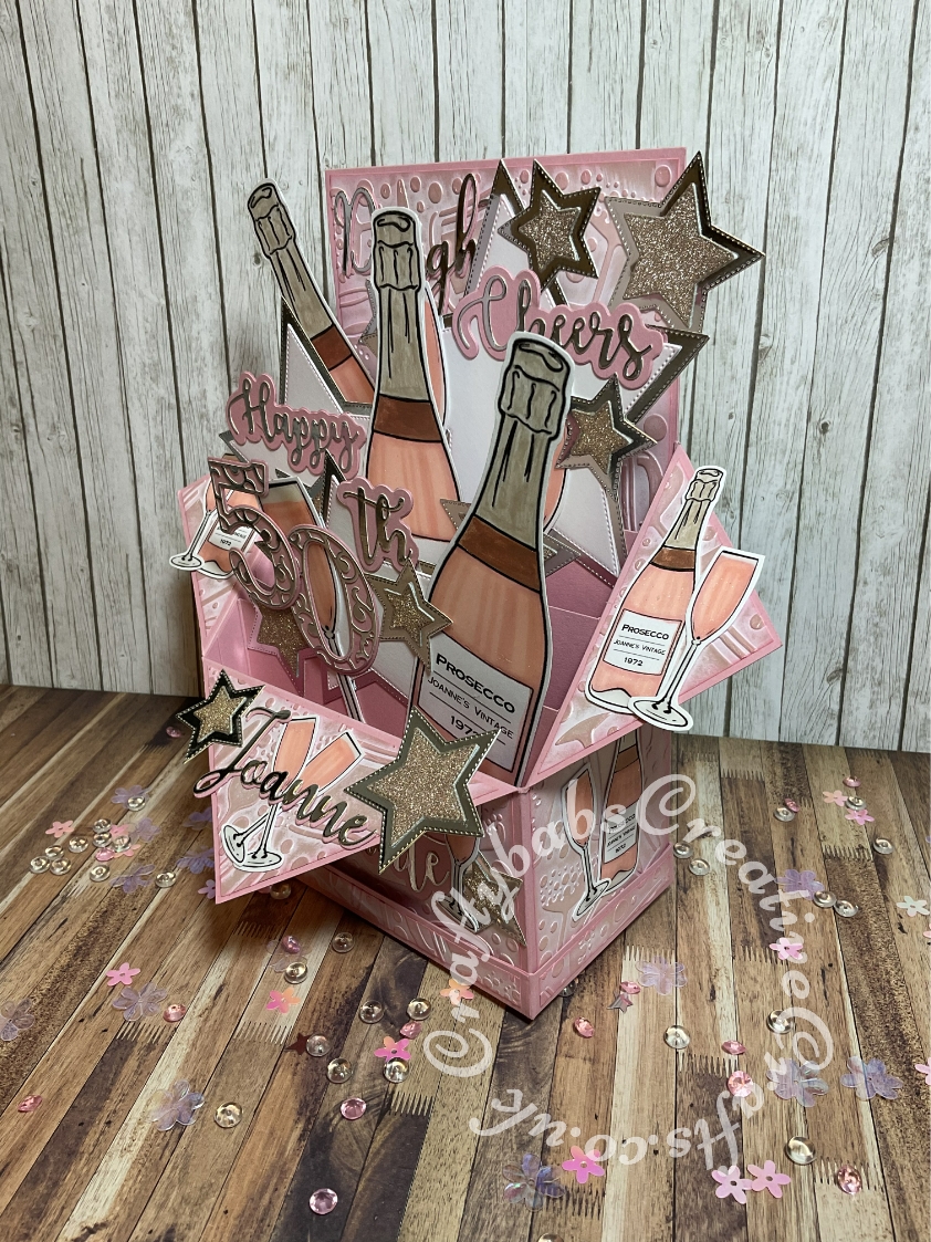 Large size Pink Prosecco themed Pop Up Box card made using various digi-stamps from Craftworld Premium members free digi-stamps cheers collection, dies including; CARD MAKING MAGIC DIE SETS SOLID & OVERLAY NUMBER & SUFFIX, i Craft Cheers & Happy dies, embossing folder and stamps from Issue 161 of Simply cards & Papercraft magazine and Sizzix thinlits Elle – Uppercase and lower case Alphabet Sets. - craftybabscreativecrafts.co.uk