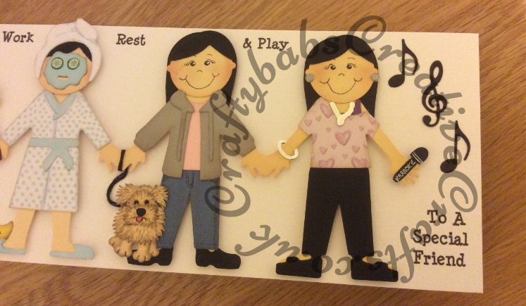 Popular work, rest & play card made using Quickutz/lifestyle crafts doll and accessories dies. Dog cut with Quickutz 2″ dog dies (edges snipped to make dog shaggy), music notes cut with MFT small musical notes die. Base card printed A4 folded lengthwise.