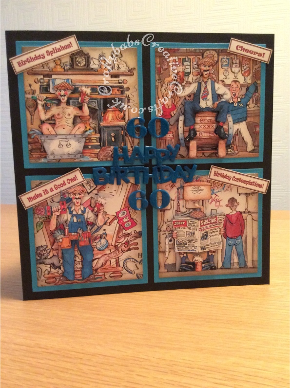 m606 Published January 30, 2019 at 595 × 797 in Men’s Ages ← Previous Next → 8″ x 8″ 60th Male Birthday card made using the La Pashe CD Rom The Big One, Flippin men decoupage reduced in size to fit and Spellbinders Etched Alphabet dies heat embossed for sentiment.