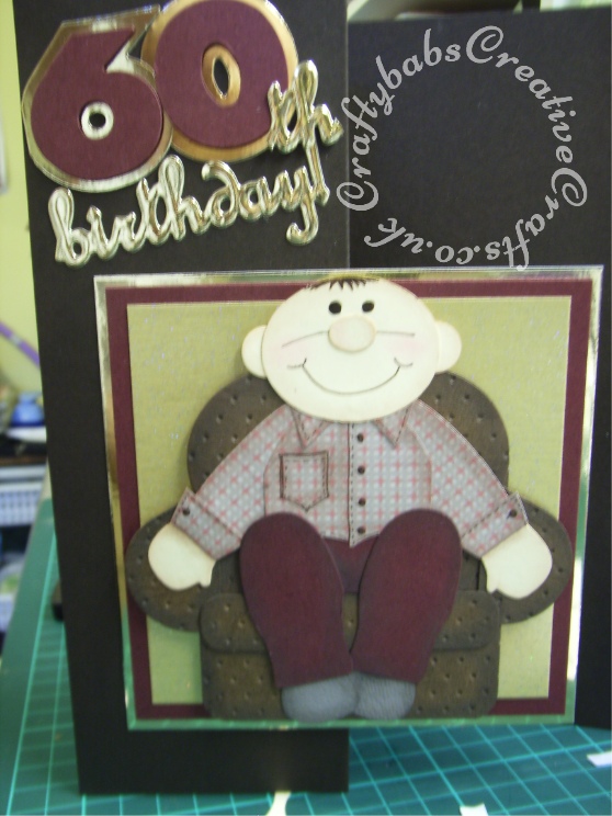 Men's Man In Armchair Birthday Card 60th Sizzix originals shadow box number dies, custom made wooden bear die & spellbinders birthday sentiment die. Nesting Quickutz label dies used to make chair - craftybabscreativecrafts.co.uk