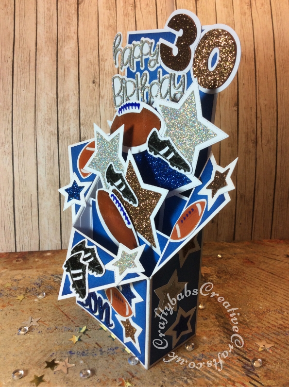 Rugby themed Pop Up Box card made using various dies including; Sizzix Originals Shadow Box Numbers, Unbranded pierced nesting stars dies, Tattered lace Football boot die, Sports Pack Metal Die set Cheery Lynn Dies B553 for small rugby ball, Ellison Cut 'n' Emboss rugby ball die, Paper Boutique male relations die and Sizzix Thinlits happy birthday from the everyday sentiment die set. - craftybabscreativecrafts.co.uk