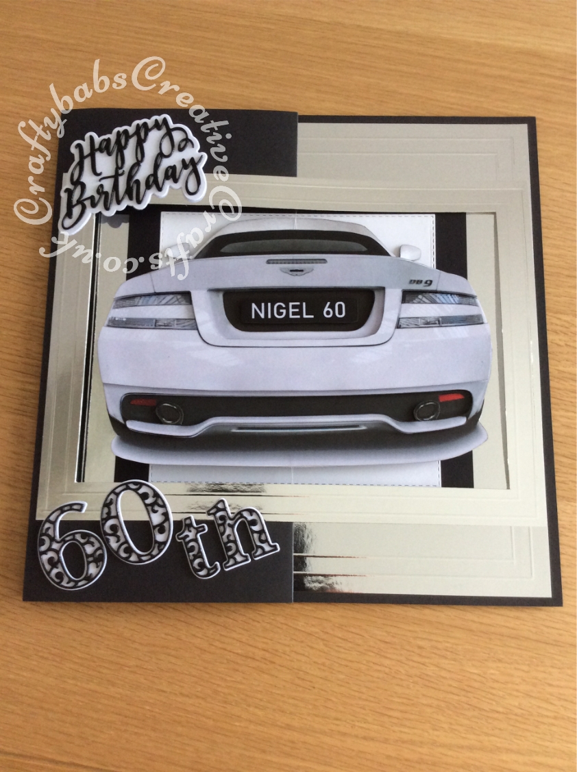 12" Square 60th 3D spinning car birthday card made using decopaged images of the car which have been heat embossed with clear embossing powder. Front and rear views mae u[ and then attched together with invisible thread in between to allow supension of completed image within the large aperture in the card allowing it to spin when the card is opened on display. Dies used include; Card Making Magic Die Set Happy Birthday Sentiment and Card Making Magic Die Sets Solid & Overlay Number & Suffix, all multi-cut and stacked to create chipboard like embellishments then heat embossed with clear embossing powder. - craftybabscreativecrafts.co.uk