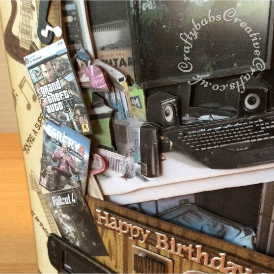 Extra special 18th birthday card made predominantly using photographs of the recipients’ actual bedroom and belongings, these were hand cut and decoupaged, then enhanced where appropriate with glossy accents. Embellishments cut using Quickutz 2×2 fishing rod die (invisible thread used for fishing line), Sizzix originals electric guitar, favourite sneekers (white embroidery thread used for laces) and shadow box number dies (embossed with woodgrain embossing folder), wooden plaques made using marianne dies, sentiments cut using cuttlebug typewriter alphabet and Tattered Lace sentiment dies. Background of card stamped using stamps from issue 31 of creative stamping magazine and inked with distress ink, Wood effect shadow box inked with distress ink through woodgrain stencil. Fishing photo and frame cut using Tattered Lace essential nesting rectangle dies.