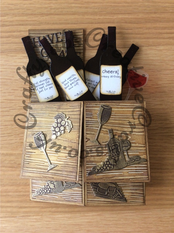 Pop up birthday card made using a variety of dies including; Tattered lace sentiment dies from 3diemensions sets paper-pieced to make appropriate words, Custom made wooden wine bottle dies, Zip-e-mate thin metal wine glass & bottle dies (for glass), Spellbinders wine with grapes & cheese dies and champagne bottle & glasses die (for small glasses). Bottle labels printed from ‘The Wine Buffs’ cd rom. Mats for card base embossed with wood grain embossing folder and inked with distress inks. Wine bottle heat embossed with clear embossing powder.