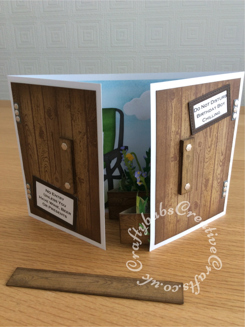 Landscape Garden Themed gate fold birthday card with pop up flower box made using various dies including X Cut A5 Die Set English Countryside Borders, Nesting stitched rectangle die, Marianne Design Craftables Cutting Dies - Wood CR1348, Custom made wooden die - Garden chair and La-La Land Die-Heart Fence die. - craftybabscreativecrafts.co.uk