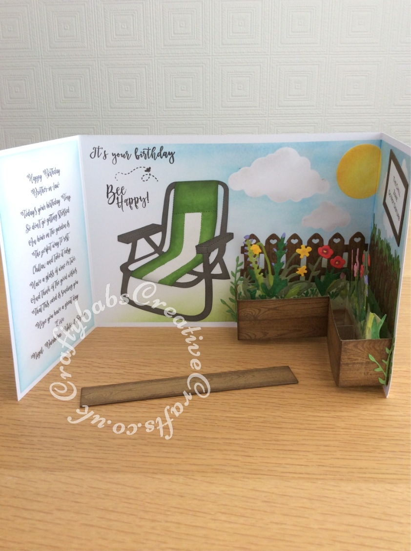 Landscape Garden Themed gate fold birthday card with pop up flower box made using various dies including X Cut A5 Die Set English Countryside Borders, Nesting stitched rectangle die, Marianne Design Craftables Cutting Dies – Wood CR1348, Custom made wooden die – Garden chair and La-La Land Die-Heart Fence die.
