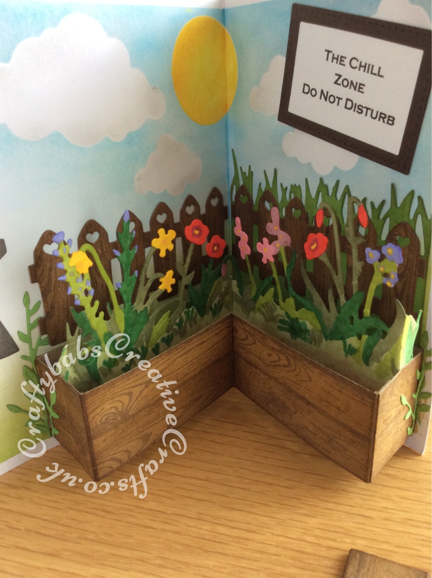 Landscape Garden Themed gate fold birthday card with pop up flower box made using various dies including X Cut A5 Die Set English Countryside Borders, Nesting stitched rectangle die, Marianne Design Craftables Cutting Dies - Wood CR1348, Custom made wooden die - Garden chair and La-La Land Die-Heart Fence die. - craftybabscreativecrafts.co.uk