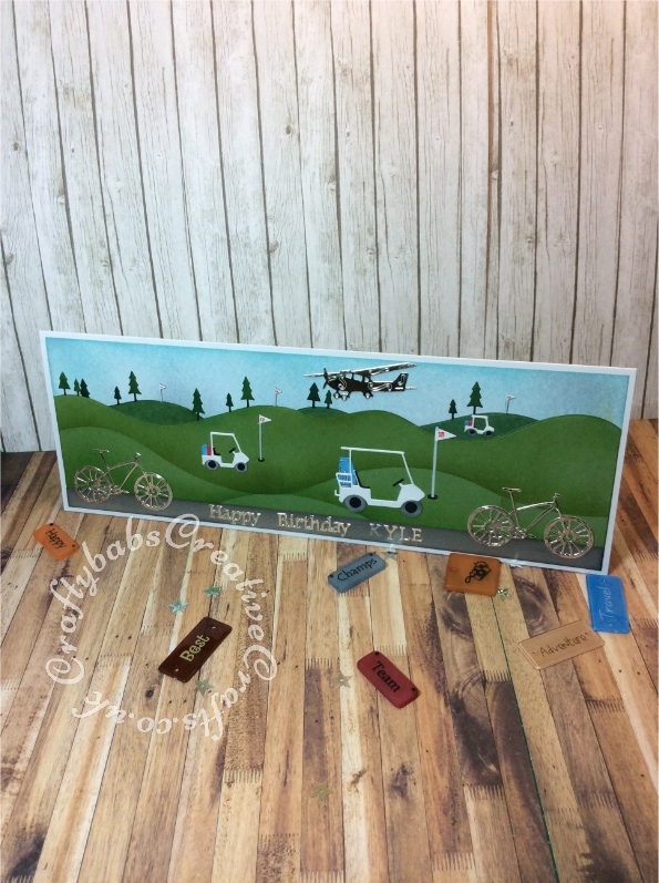 Golf and cycling themed card made using various dies including; Memory Box Dies, Mini Golf Carts, Memory Box Golf cart, Memory Box Golf landscape die, Tattered Lace Hat and Cane embellishments set for the aeroplane and Tattered Lace sentiments 2014 dies. Cycle from the Hunkydory Moonstone Build a shed die set. - craftybabscreativecrafts.co.uk