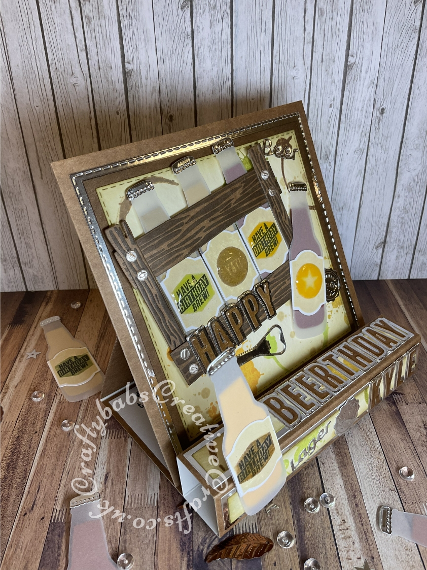 Pop up Easel Block Birthday Card. Fold inspired by Sam Calcott of Mixed up craft. Made using various dies and stamps including:- Stampin Up 'Bubble Over' stamp and dies set. Apple blossom drinks trolley beer bottle and glass die set for bottle opener, Unbranded layered alphabet dies, and CR1348 ~ WOOD ~ Marianne Design Craftables Die. - craftybabscreativecrafts.co.uk
