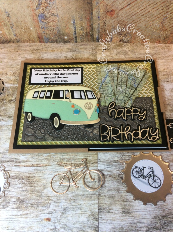 Z Fold travel themed male birthday card made using various dies including Robert Adams All Occasion Dies Camper Van - Metal Craft Dies Set, Sizzix thinlits happy birthday from the everyday sentiment die set and Spellbinders M-Bossabilities - Kickin' Rubber embossing folder. Patterned papers from the Papermania DoCrafts Mr Mister collection. - craftybabscreativecrafts.co.uk