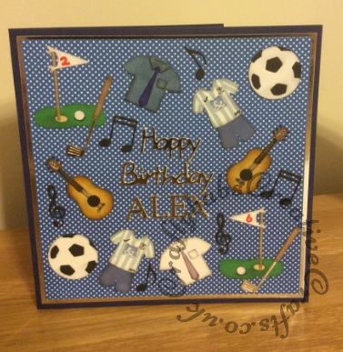 Men’s birthday card Published December 4, 2015 at 377 × 387 in Men’s Hobbies & Interest Next → Man’s card reflecting various interests. Made using Quickutz 2×2 dies for most items, MFT music note dies, Marianne sentiment dies and Spellbinders Sapphire alphabet number one dies.