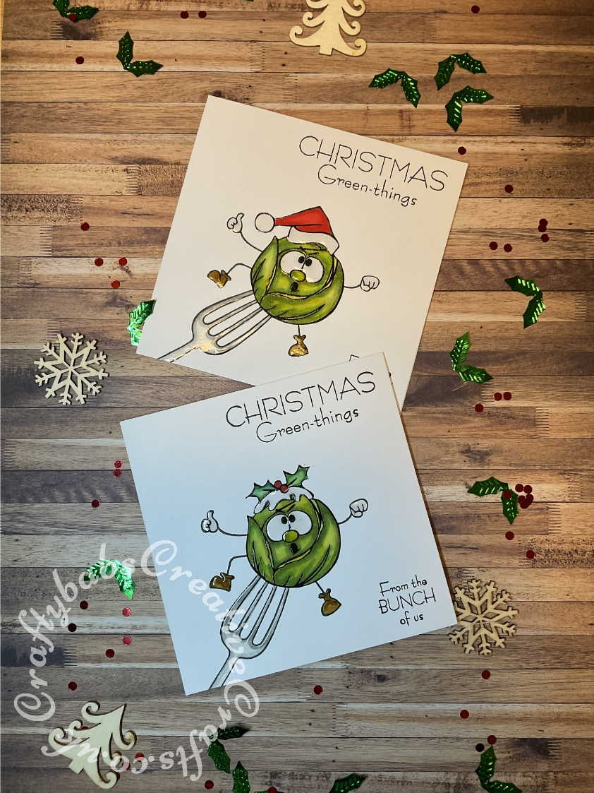 Batch made stamped Christmas cards made using Christmas Green Things Sprouts (CS250D) by Hobby Art Stamps, images stamped, heat embossed and then water coloured with Tim Holtz Distress ink reinkers, then fussy cut and embellished with glossy accents. - craftybabscreativecrafts.co.uk