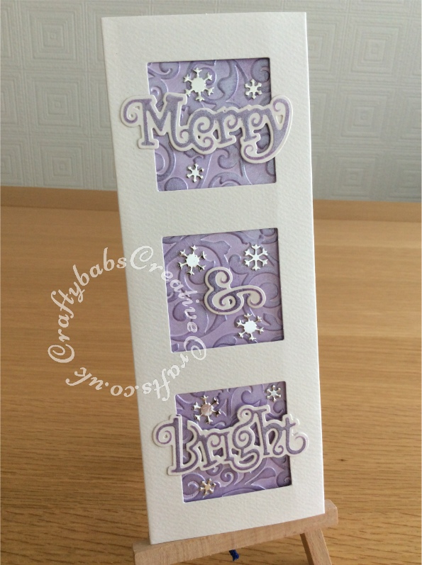 Batch Make Christmas cards made using triple aperture card blanks, Embossalicious A4 embossing folder, Spellbinders - Christmas - D-Lites Dies - Holiday Merry and Bright, Tattered Lace - Dies - Essentials Tuck In Christmas Snowflakes die, Cosmic Shimmer gilding polish and Time Holtz Distress inks. - craftybabscreativecrafts.co.uk