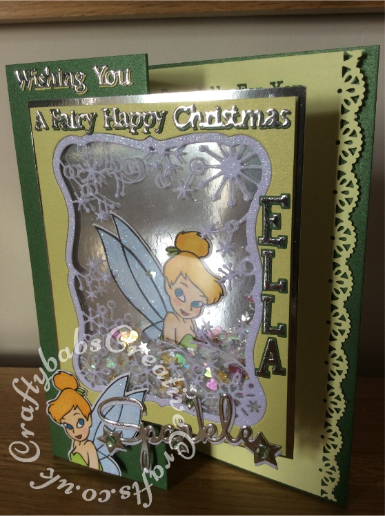 Shaker Christmas Card for a Tinkerbell fan made using a variety of dies including; Tattered Lace Christmas sentiments, Memory Box Frostyville and Debutante Frames, Sizzix Girls are Wierd alphabet, Cuttlebug Tinkerbell cut and emboss die set (coloured with promarkers) and Tonic Sparkle sentiment dies. Frostyville frame glittered with stickles glitter glue.