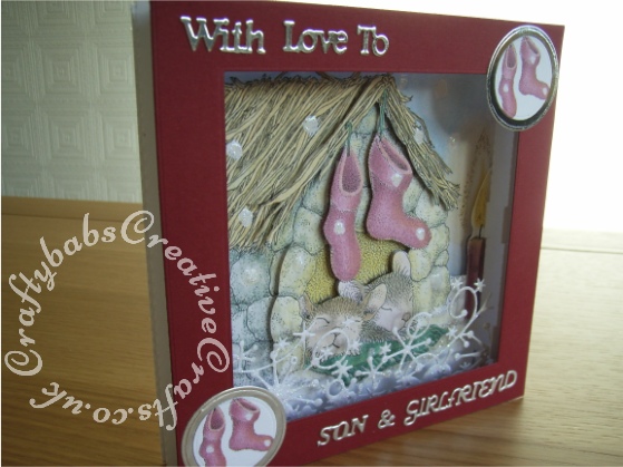 Housemouse 3D Panorama Christmas card made using Joanna Sheen's Housemouse CD roms, Tattered Lace Panorama and essentials squares dies, Tattered lace Christmas and relatives sentiment dies, nesting circle dies and Memory Box frostyville border die - craftybabscreativecrafts.co.uk
