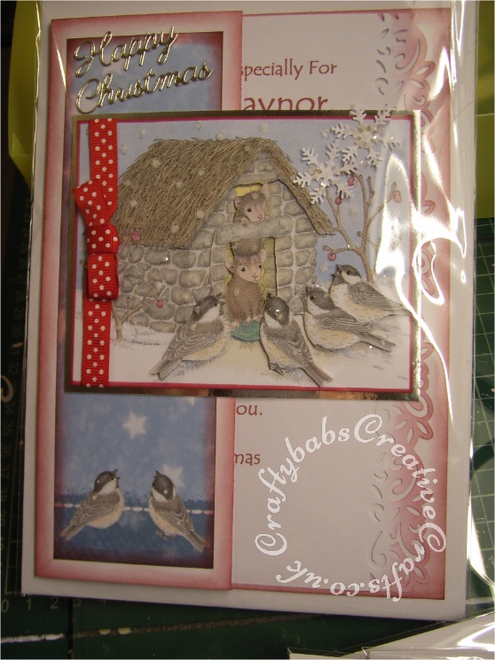 Housemouse Decoupage Stepper Christmas card made using Joanna Sheen's Housemouse CD roms, Xcut snowflake punch and Britannia dies Happy Christmas sentiment dies - craftybabscreativecrafts.co.uk