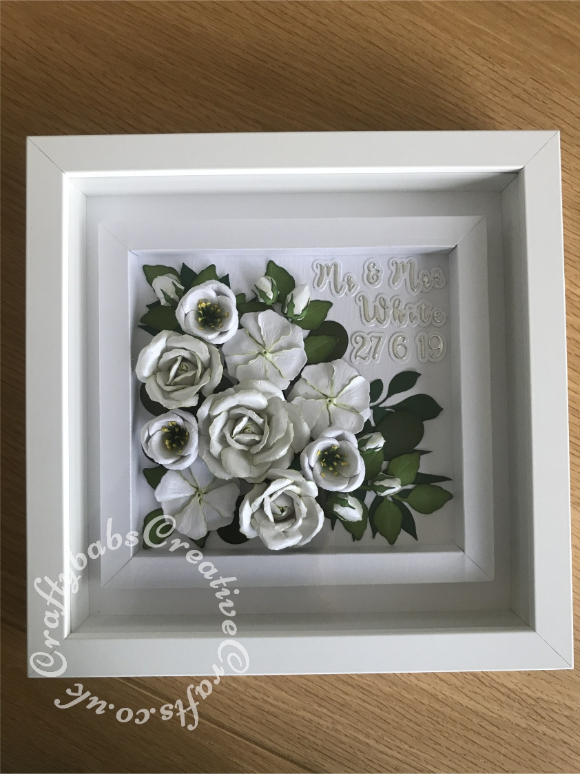 Bridal Bouquet Wedding Keepsake Picture replicating the flowers included in the brides actual bouquet. Flowers created using various dies including Cheery Lynn Designs - Build A Flower #2 - Petals & Leaves, Cheery Lynn Designs Die Build a Flower Embellishment 2 set, Spellbinders Shapeabilities Foliage Die Set, Spellbinders Rose Creations die set, Spellbinders Die D-Lites - Create a Stargazer Lily, Pokey Stems Memory Box Die, Sue Wilson Dies - Finishing Touches - Spring Foliage, Fuzzy Lemon die balloon bunch, Quickutz/lifestyle Crafts Nesting Balloons Cookie Cutter Dies, Tattered Lace Essential Teardrops (ETL183), Altenew Garden Picks 3D Die Set and Spellbinders D-Lites Blooms Three Die. Lettering created using Gemini Die Set Expressions Uppercase Alphabet, Gemini Die Set Expressions Lowercase Alphabet and Gemini Expressions Metal Die - Numbers set. - craftybabscreativecrafts.co.uk